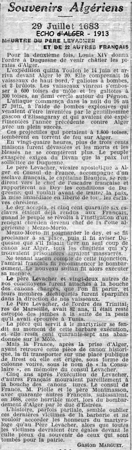 d'Alger. L'expédition quitta Toulon le 14 juin et arriva devant Alger le 20. Elle comprenait 16 vaisseaux de haut bord, 7 galiotes à bombes et 2 brûlots. Les vaisseaux vinrent s'embosser à 600 toises du môle et les galiotes à 300 toises, en demi cercle autour du Pégnon. L'attaque commença dans la nuit du 26 au 27 juin, à l'aide de bombes explosives qui venaient d'être inventées par le gentilhomme gascon d'Elissagaray et qui avaient été expérimentées l'année précédente contre Alger avec un plein succès. Ces projectiles qui perlaient à 1.800 toises, tombèrent en torrent de feu sur Alger. En vingt-quatre heures, plus de trois cents maisons furent dévastées et les morts et les blessés ne se comptèrent plus. Le peuple exaspéré exigea du Divan que la paix fut sollicitée de Duquesne. Le père Levacher, vicaire .apostolique à Alger et Consul de France, accompagné d'un esclave français, le capitaine Beaujeu, se rendirent vers le chef de l'escadre française et rapportèrent au Dey les conditions de Duquesne, qui voulait avant de traiter la paix, la mise immédiate en liberté de tous les esclaves chrétiens. ( suite dans le texte.) |
