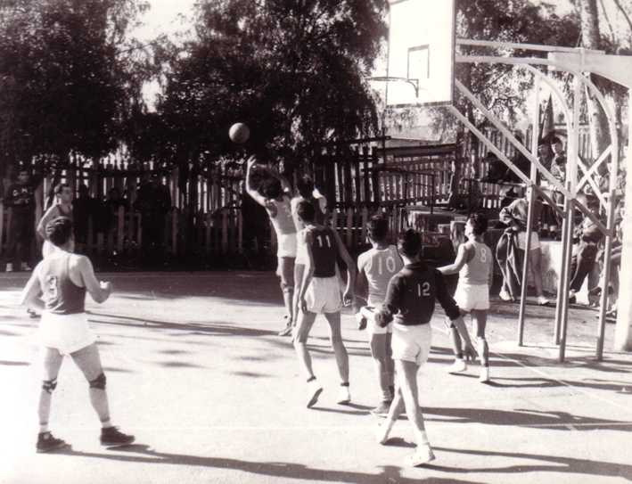 STADE Henri ANGLADE avec le C.I.T.160 contre le 28e TRAIN et toujours le même score de 35 à 26: On voit sur cette photo les tringlots d'ORAN envahir la zone algéroise avec un tir à mi-distance qui semble partir du sous-lieutenant VITTET. On reconnaît parmi les tringlots d'ALGER (maillots noirs) de gauche à droite,le lieutenant CARLOT, ORTHEL qui regarde vers l'EST, REY, le brigadier NAVARRO(11) et FRANCOIS(12) qui attendent d'être rapatriés dans leurs foyers. Moi, j'attendrai cinq ans de plus pour regagner mon nouveau paradis, la FRANCE avec une joie ''j'vous dit pas''. Et j'allais oublier, toujours l'immense foule de spectateurs qui acclame les jeunes acteurs de ce match d'un haut niveau technique. |
